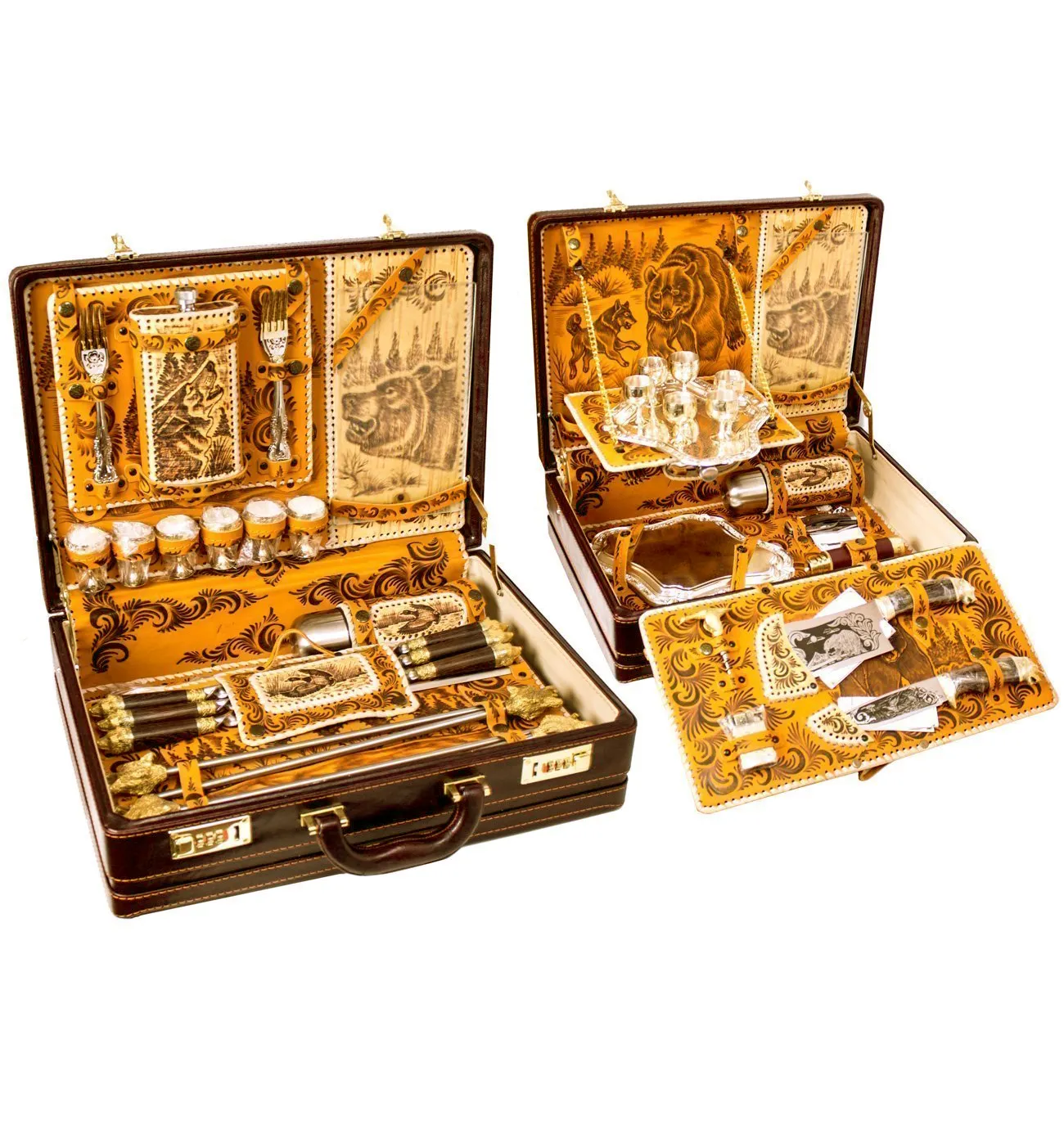 Что может быть лучше пикника на природе? Однако для такого времяпровождения приходится брать с собой множество необходимых мелочей. Гораздо удобнее, если все они уже есть в подарочном наборе в чемодане. Комплектация набора "Люкс" рассчитана на 6 персон. В него входят мангал, тарелки, ножи, зажигалка, термос, штопор, шампура и даже подзорная труба. В удобном чемодане поместится все необходимое. Он создан из прочного материала, поэтому риск повредить "снаряжение" для пикника при транспортировке равен нулю. Изделия произведены из пищевой стали, латуни и бронзы. Рукоятки шампуров выполнены из натурального дерева. Красивый оригинальный набор для пикника станет прекрасным подарком для начальника, который любит активный отдых на природе.