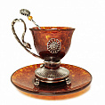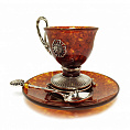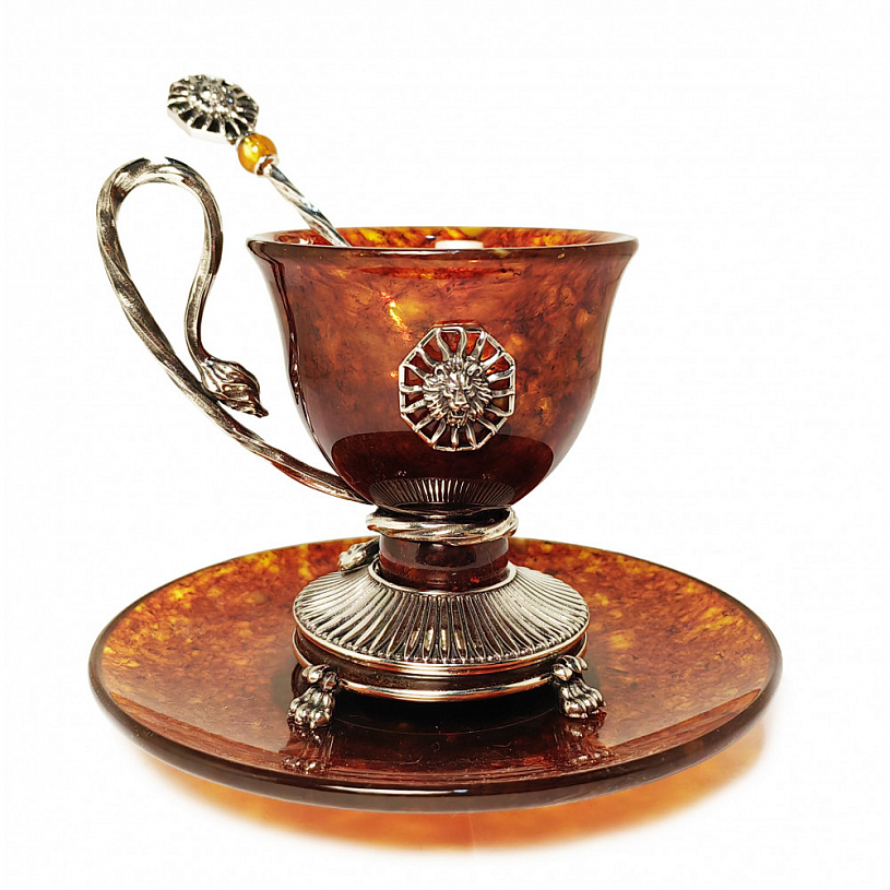 Материалы: Чаша и блюдце выточены из цельного куска натурального янтаря благородного коньячного оттенка. Металлические детали изготовлены из высококачественной белой бронзы.