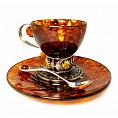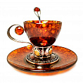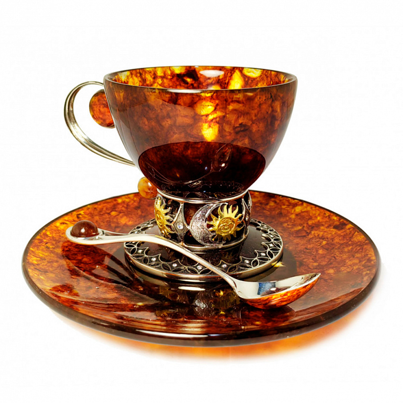 Детали: Элегантная изогнутая ручка чашки украшена крупной янтарной вставкой. В комплект входит ложечка с уникальной ручкой, завершающейся янтарным шаром.