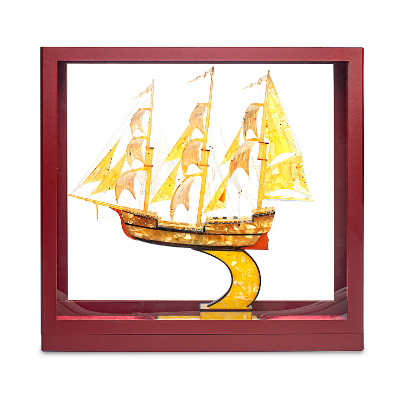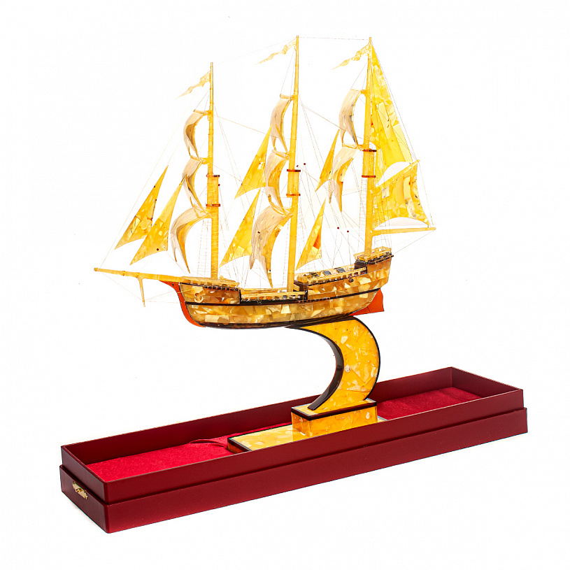 Корабль выполнен из натурального янтаря (основа корпуса - дуб, облицовка - янтарь, паруса и оснастка - янтарь).