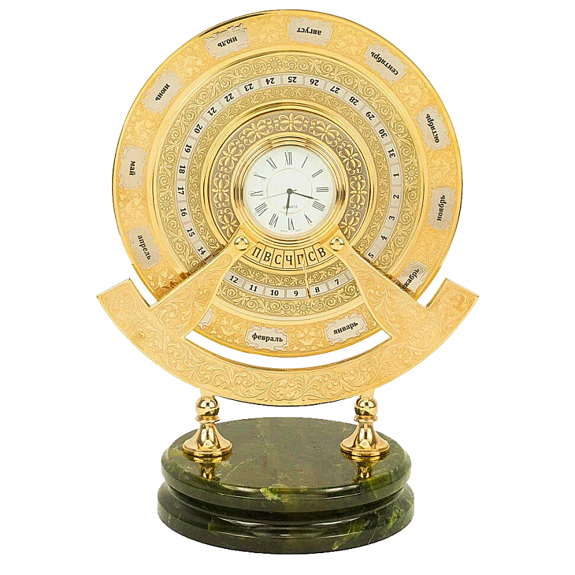 Часы "Вечный Календарь" выполнены Златоустовскими мастерами которые славятся своим искусством изготовления настольных сувениров из металла. В технике исполнения были проведены такие работы как травление, гравирование иглой, гравирование резцом, никелирование, золочение, обработка камня.