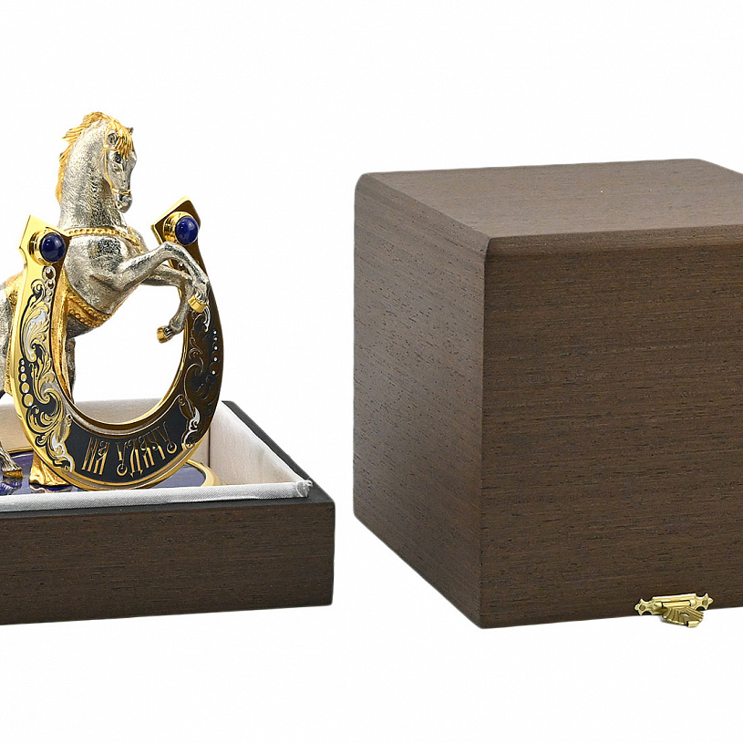 Подарочная подкова "На удачу" от мастеров Златоуста — это не просто сувенир, а настоящее произведение искусства, обладающее глубоким символическим значением. Изготовленная из высококачественного металла, эта подкова украшена элегантной гравировкой и покрыта золотом, который отражает традиции и мастерство златоустовских кузнецов.