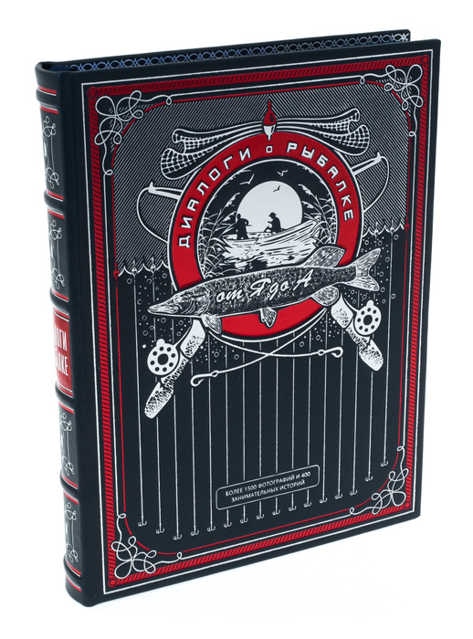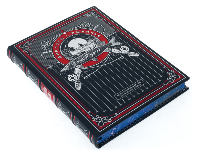 Оригинальный подарочный набор включает в себя книгу в кожаном переплете «Диалоги о рыбалке» и плакетку, оформленных в деревянной коробке, обтянутой кожей. Дизайн издания представлен сочетанием блинтового, золотого и цветного тиснения. Крашеный обрез. Богато оформленные дюблюрами форзацы, шелковое ляссе. Плакетка изготовлена из литьевого пластика в сочетании с деревянной основой.