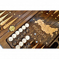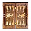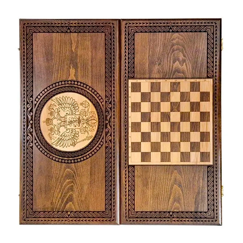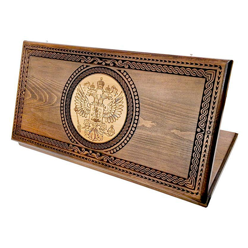 Доска сделана из натуральной древесины высокого качества. Верхняя крышка декорирована рельефным изображением герба РФ и красивым узором. Нижняя крышка – поле для шашек. Разворот полностью отведен под нардовое поле. Доска оснащена медной фурнитурой и защищена от царапин глянцевым лаком.