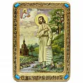 Тело иконы сделано из массива сакрального кипариса с выборкой двойного ковчега. Поля иконы и венцы оформлены русским орнаментом и украшены натуральными камнями (бирюза).