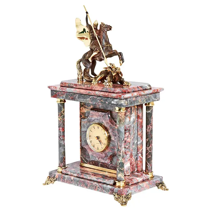 Часы сейф сделаны из итальянского мрамора и украшены бронзовой скульптурой, выполненной по технологии художественного литья. Роскошь бронзы, прочность натурального камня, символичность украшения – все это делает часы сейф истинным произведением искусства. Изысканный, нужный сувенир, призванный служить на пользу своему обладателю.