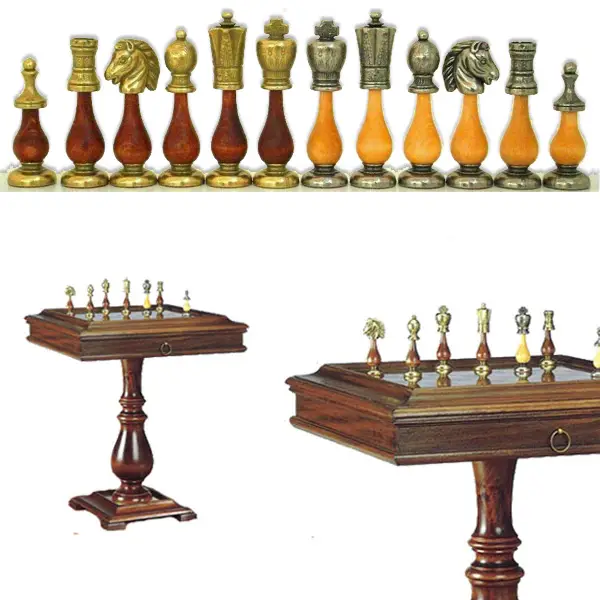 Этот уникальный стол выполнен из красного дерева, каждая деталь тщательно изготовлена мастерами, чтобы создать идеальное сочетание красоты и функциональности. На столе располагается шахматное поле, выполненное с учетом всех стандартных размеров и линий. Фигуры для шахмат сделаны из бронзы и олова, они имеют утонченные детали и отличную проработку.