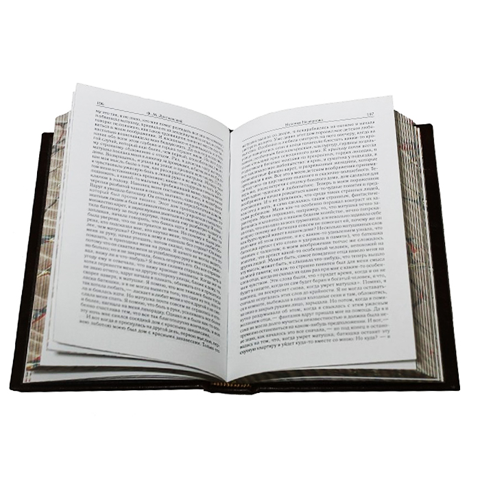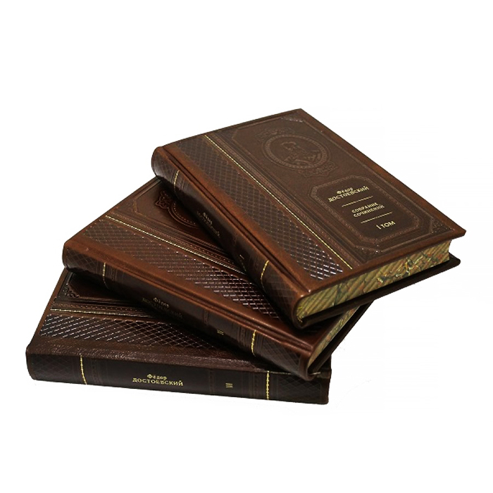 Богато оформленное собрание, представлено в подарочном издании. Цельнокожаный переплёт ручной работы, украшен золотым иблинтовым тиснением. Корешок декорирован бинтами. Текст книг напечатан на мелованной бумаге . Обрез оформлен в технике "Перо павлина". Ляссе из шёлковой ленты. Форзац цельный из дизайнерской бумаги.