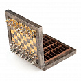 В премиальном наборе представлено 16 видов фигур на магнитах (по 8 типов с каждой стороны), в общем количестве 32 единицы. Доска-ларец выполнена из тонированной карельской березы, вручную, специально для дорожных шахмат. Под игровым полем установлена стальная пластина для крепежа серебряных фигур на магнитах. Два вида игровых фигурок вставлены в 32 ячейки внутри доски.