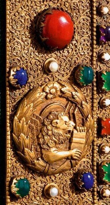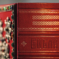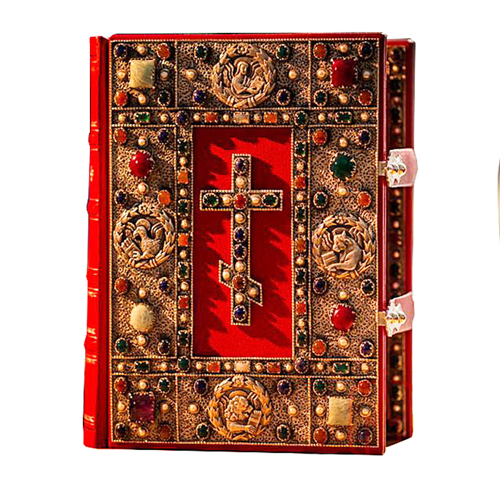 Великая Книга Книг в переплете ручной работы из кожи красного или зеленого цвета. На переплете тиснение золотом.
