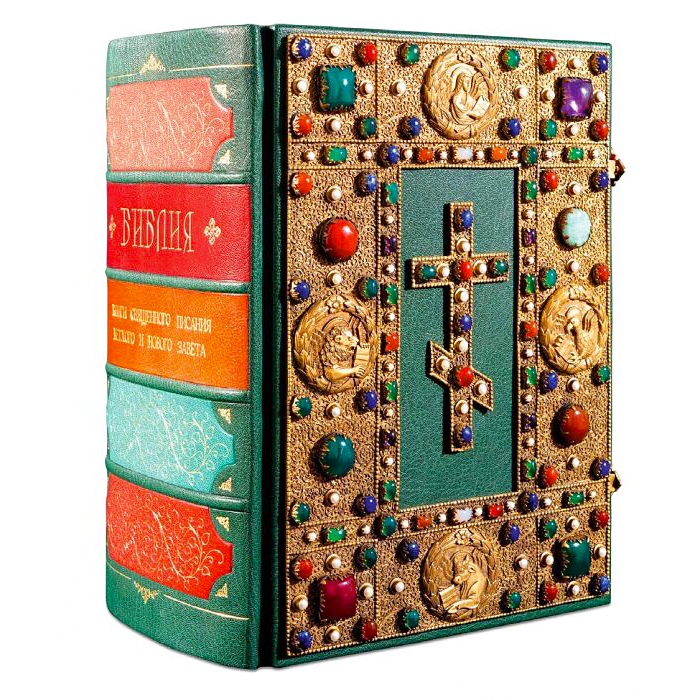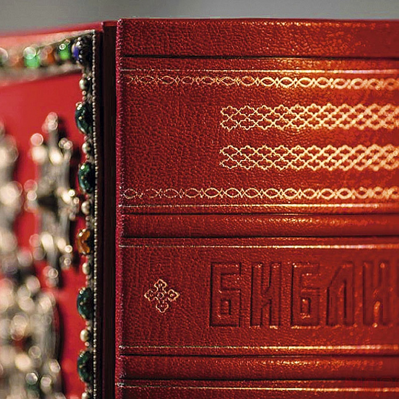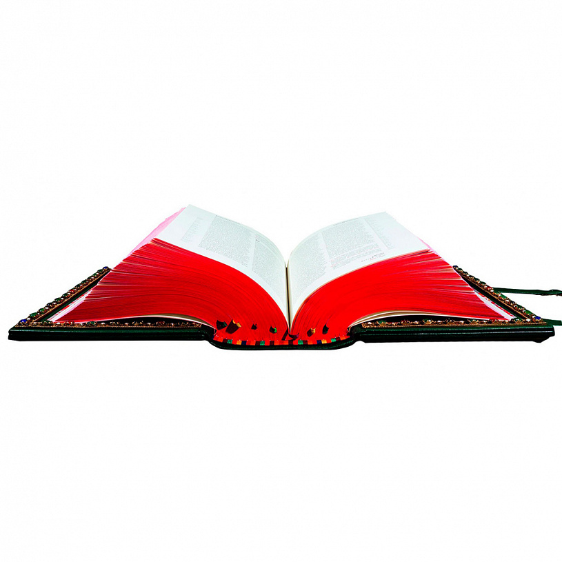 Уникальная Библия Книжного выпущена в особом оформлении: в металлическом окладе с полудрагоценными камнями. Книжный блок напечатан на дизайнерской бумаге Favini австрийского производства. Форзацы из мраморной бумаги ручного крашения. Переплет ручной работы из кожи козы с окладом из серебра, украшенным лазуритом, ониксом, сердоликом и жемчугом. На переплете плоскоуглубленное тиснение золотом. Текст Книги Книг сопровождается цветными иллюстрациями на всемирно известные библейские сюжеты. Для оформления использованы фрагменты фресок Гауденцио Феррари из церкви Санта-Мария делле Грацие, Италия, 1513. Великая Книга Книг в переплете ручной работы из кожи красного или зеленого цвета. На переплете тиснение золотом.