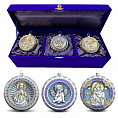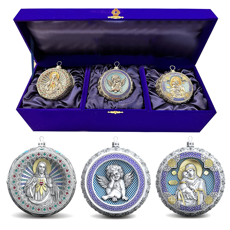 Набор из 3 серебряных ёлочных шаров "Спаситель, Ангелочек и Владимирская Богородица"