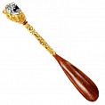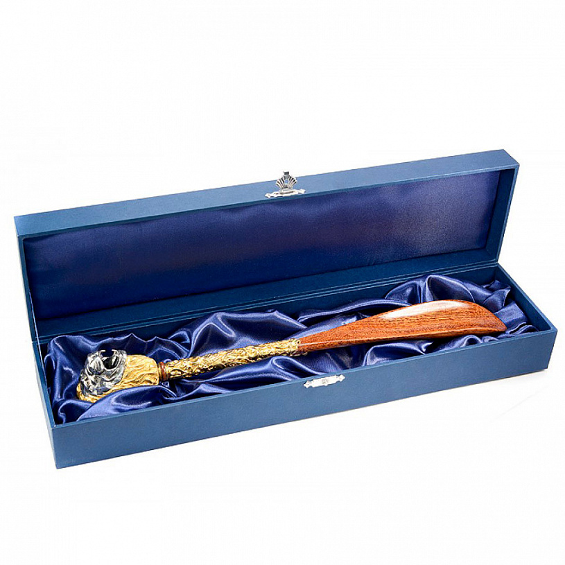 Ручка рожка выполнена из серебра в виде львиной головы с позолоченной гривой. Вдоль ручки расположен изящный объемный узор, выполненный так же в серебре с позолотой. Сама ложка выполнена из древесины падук.