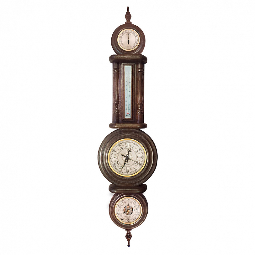 Представляем Метеостанцию Часы "Орех 3", которая включает в себя часы, а так же термометр, барометр и гигрометр. Также имеется комплектация с часами. Классический дизайн метеостанции позволяет ей прекрасно вписаться практически в любой интерьер, от офисных кабинетов до загородных домов. Мы гарантируем высокое качество изготовления этой метеостанции и предоставление гарантии на 12 месяцев как на механизмы, так и на корпус изделия. Сборка, шлифовка и окраска всех изделий проводится вручную.