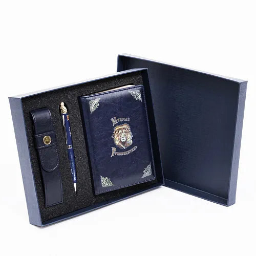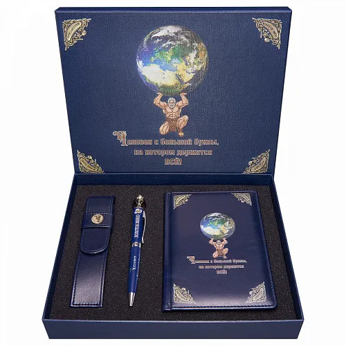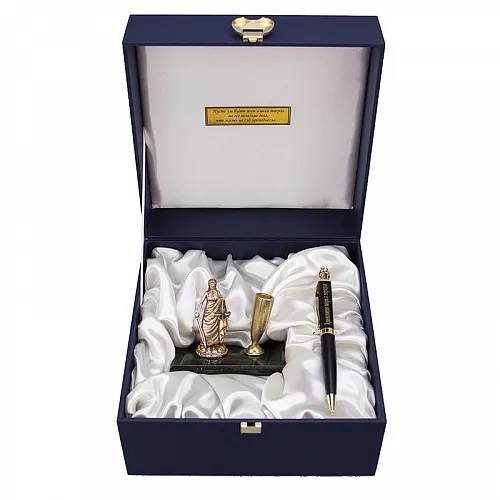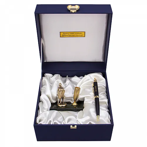 Вы также можете купить комплект, украшенный изящной статуэткой, например Георгия-победоносца, или в строгом деловом стиле. Сувениры, оформленные флагом России, двуглавым орлом и короной империи, добавят месту начальника значимости, подчеркнут мужественность, укрепят дух.