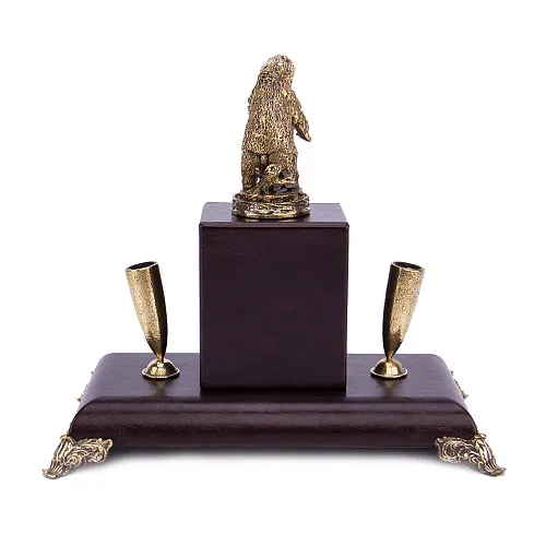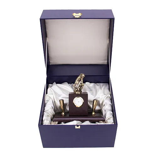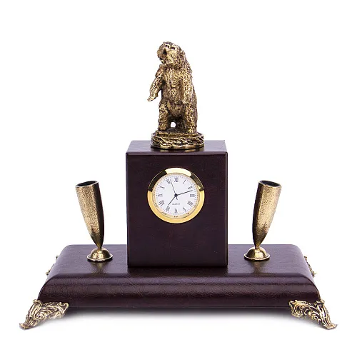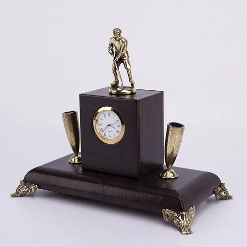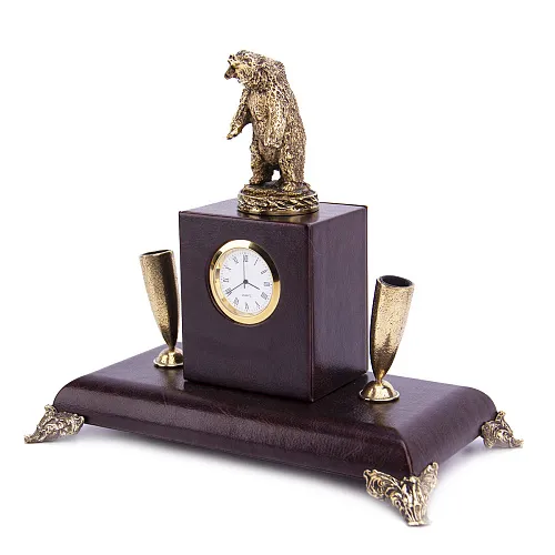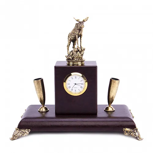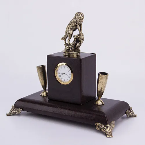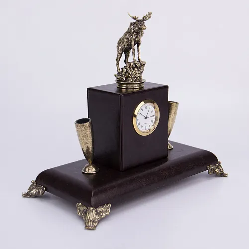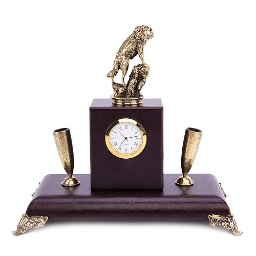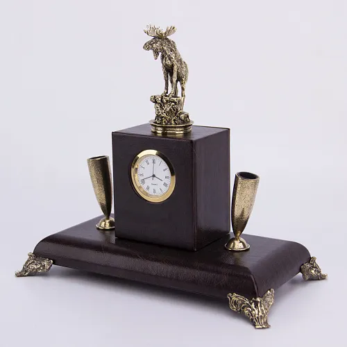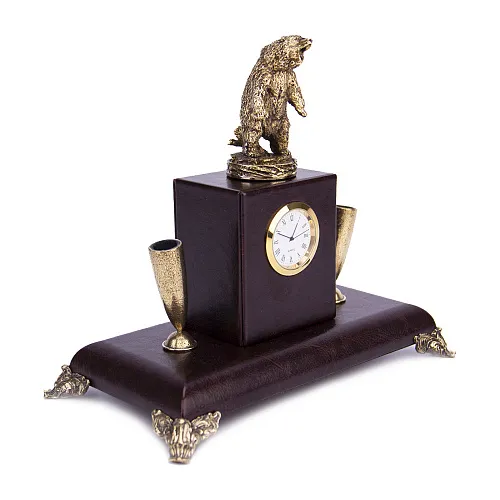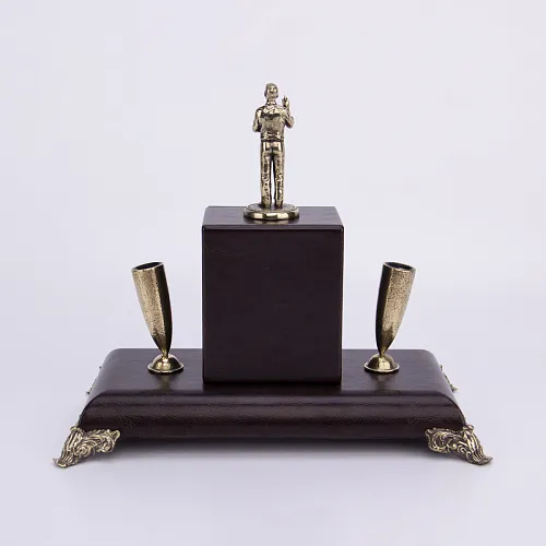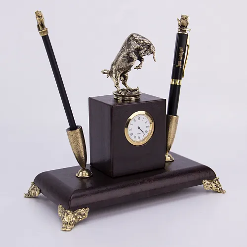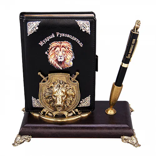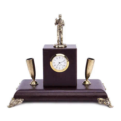 Вы также можете купить комплект, украшенный изящной статуэткой, например Георгия-победоносца, или в строгом деловом стиле. Сувениры, оформленные флагом России, двуглавым орлом и короной империи, добавят месту начальника значимости, подчеркнут мужественность, укрепят дух.