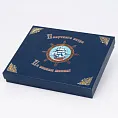 Подарочная коробка — дизайнерская бумага Клесси Каверс синего цвета, ложемент из поролона. Размер — 26,5 х 21,5 х 2,3 см.