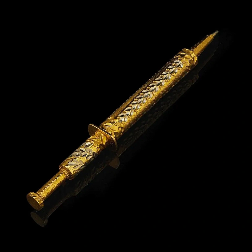 Изделие выполнено в технике Златоустовской гравюры на металле. Токарные работы, рисовка кистью, гравировка иглой по лаку, травление, гравировка резцом, полировка, никелирование, золочение.
