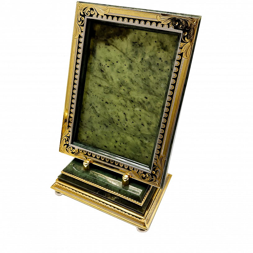 нефрит, латунь, никель, золото, чернение, эмаль.