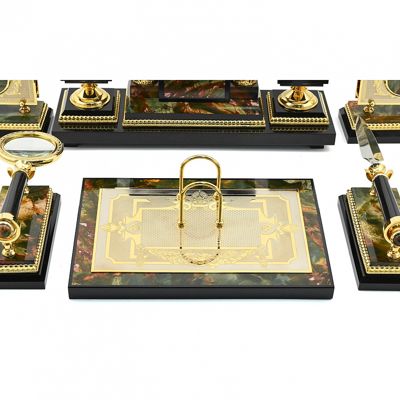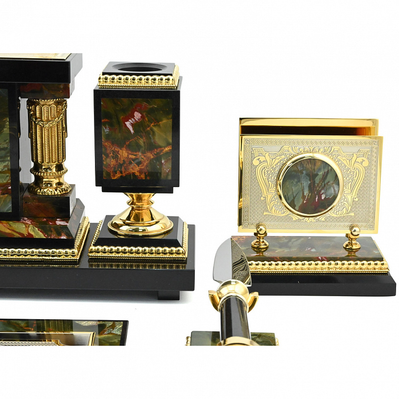 Этот письменный набор станет не только практичным аксессуаром для рабочего стола, но и изысканным подарком, символизирующим статус, вкус и уважение к традициям. Он идеально подойдет для ценителей роскоши, истории и искусства.