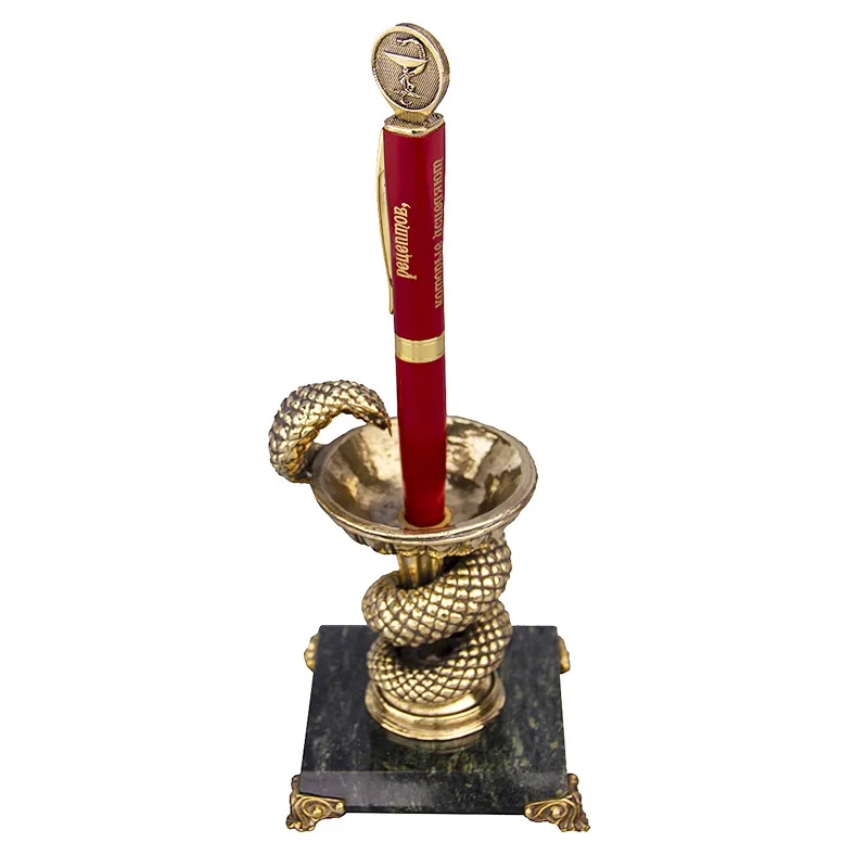 Держатель для ручки: точное художественное литье из латуни. Выполнен в виде символа медицины. Основание изготовлено из природного камня Серпентинит (Змеевик), добытого на Чебаркульском месторождении Урала. Камень представляет собой многослойный пирог из минералов. Он готовился много миллионов лет назад на древних вулканах при остывании расплавленной Земной коры. Цвет и структура в разных местах добычи разная. Эта особенность натуральных камней указывает на природное, а не искусственное происхождение. Нет ни одного похожего камня. Это значительно повышает ценность подарка. Ножки из латуни. Размер держателя: 8х8х12 см.