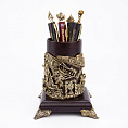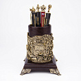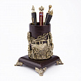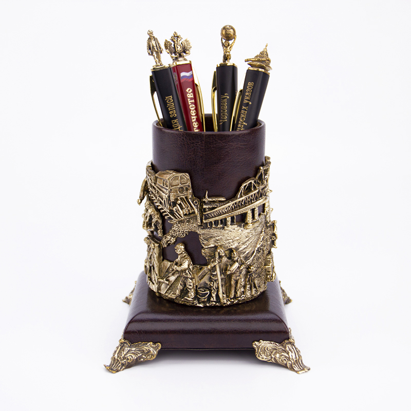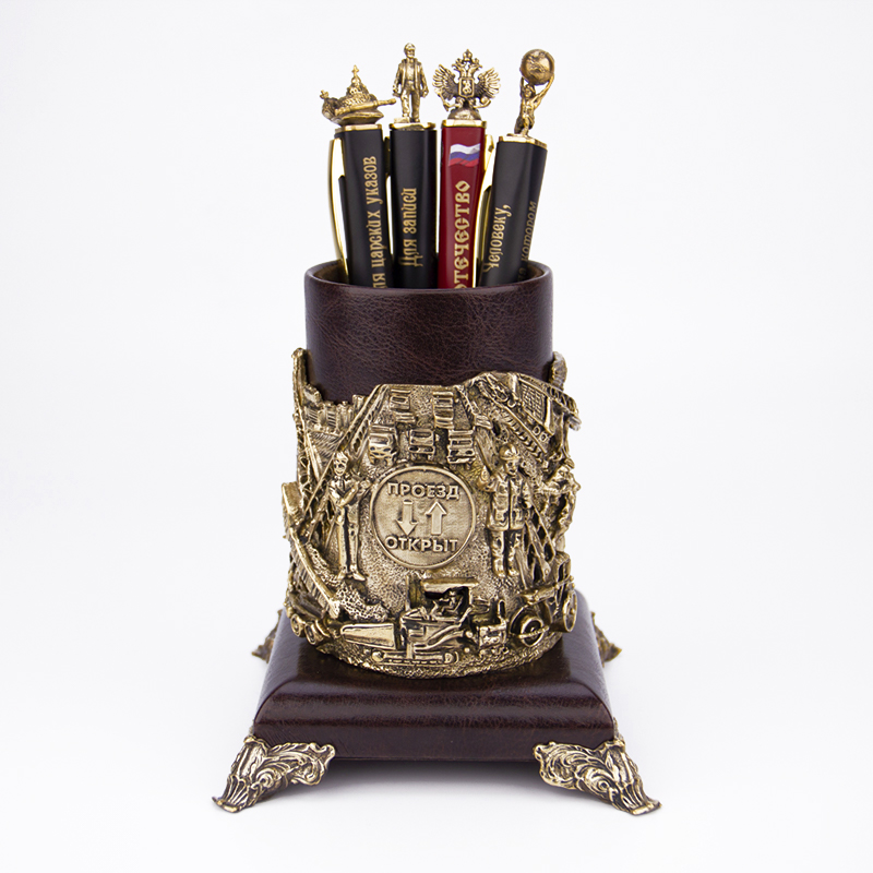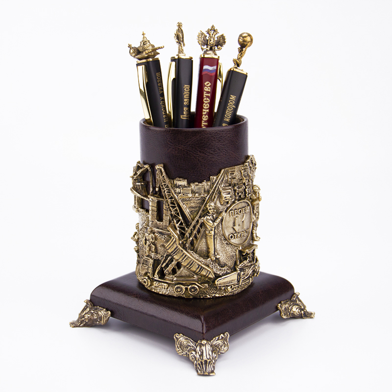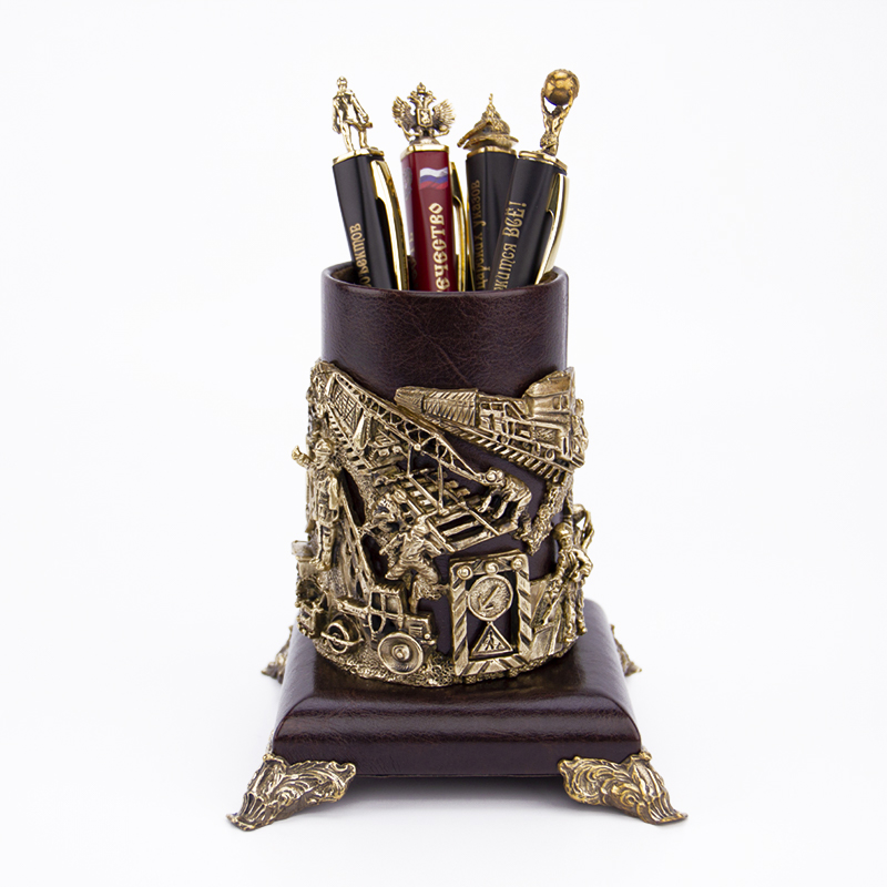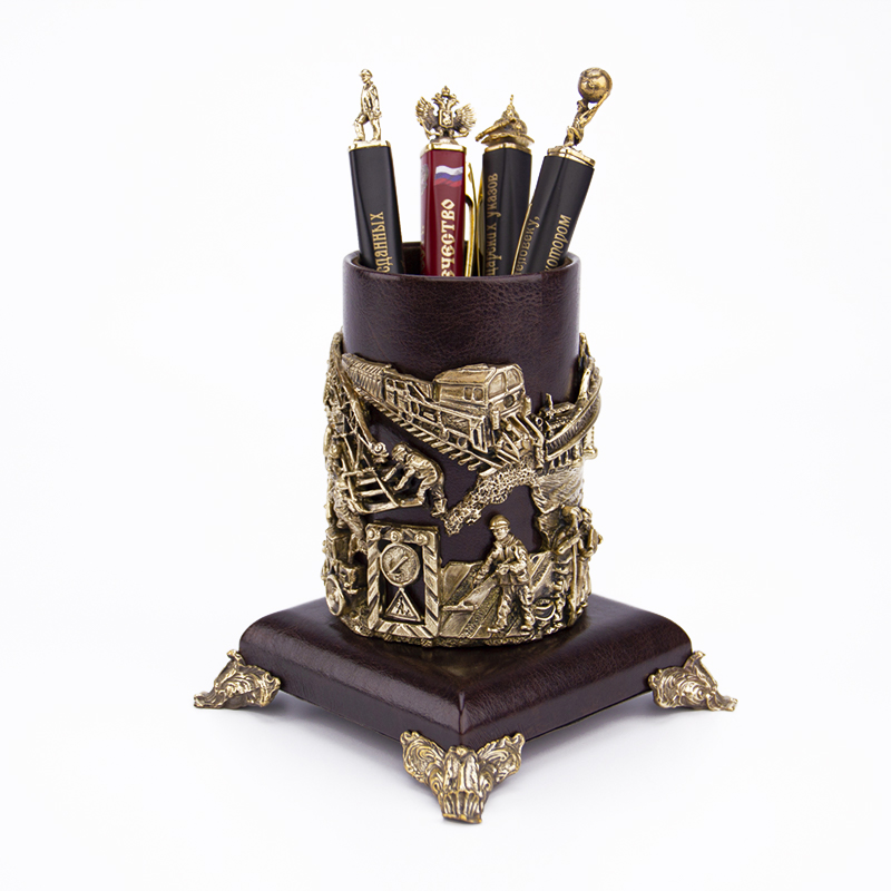 Материал набора: стакан - кожа, подстаканник - бронза, подставка - кожа с бронзовой фурнитурой.