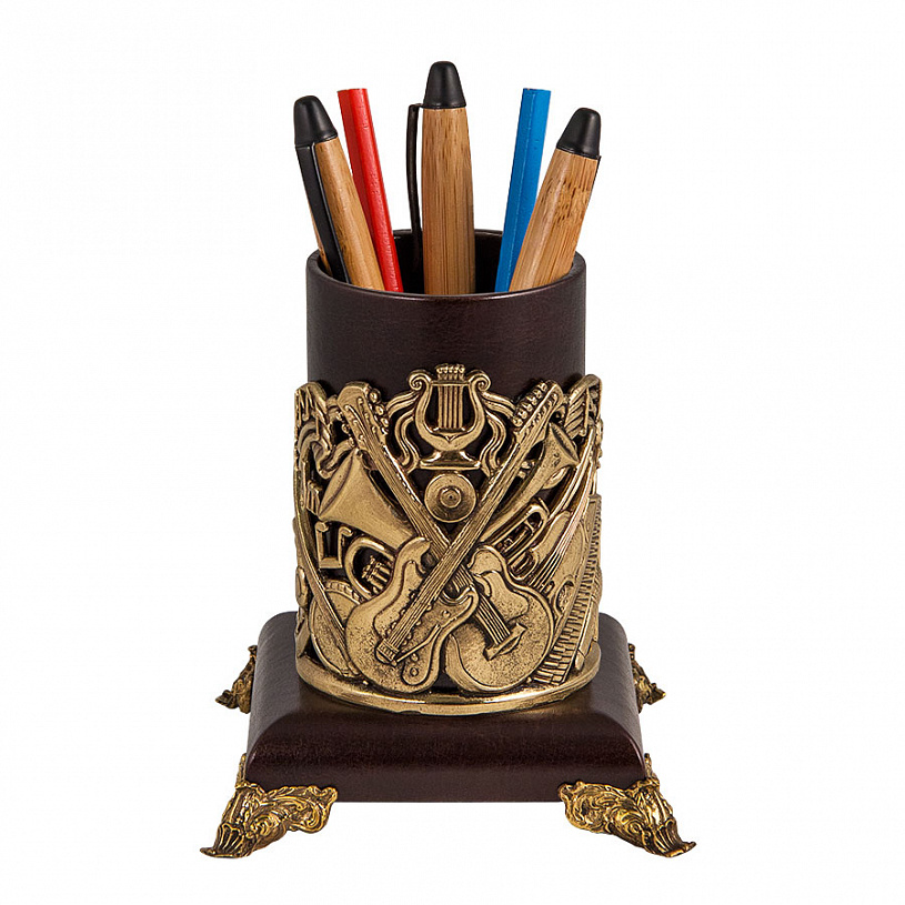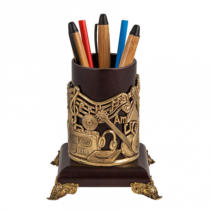 Материал набора: стакан - кожа, подстаканник - бронза, подставка - кожа с бронзовой фурнитурой.