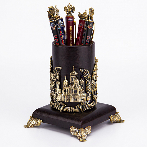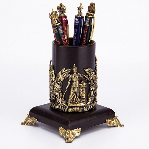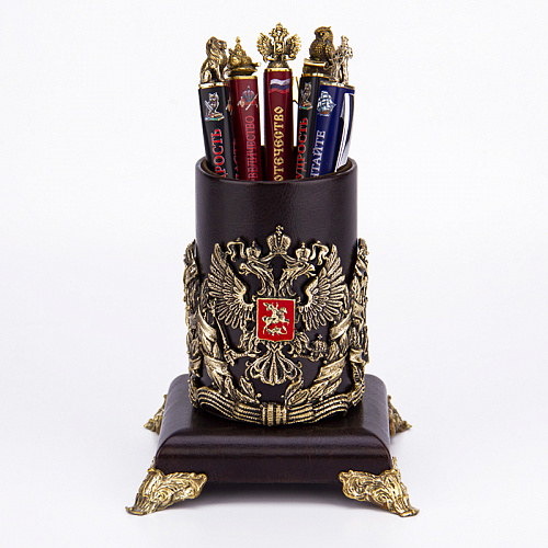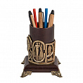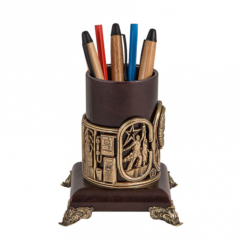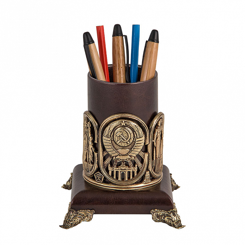 Материал набора: стакан - кожа, подстаканник - бронза, подставка - кожа с бронзовой фурнитурой.