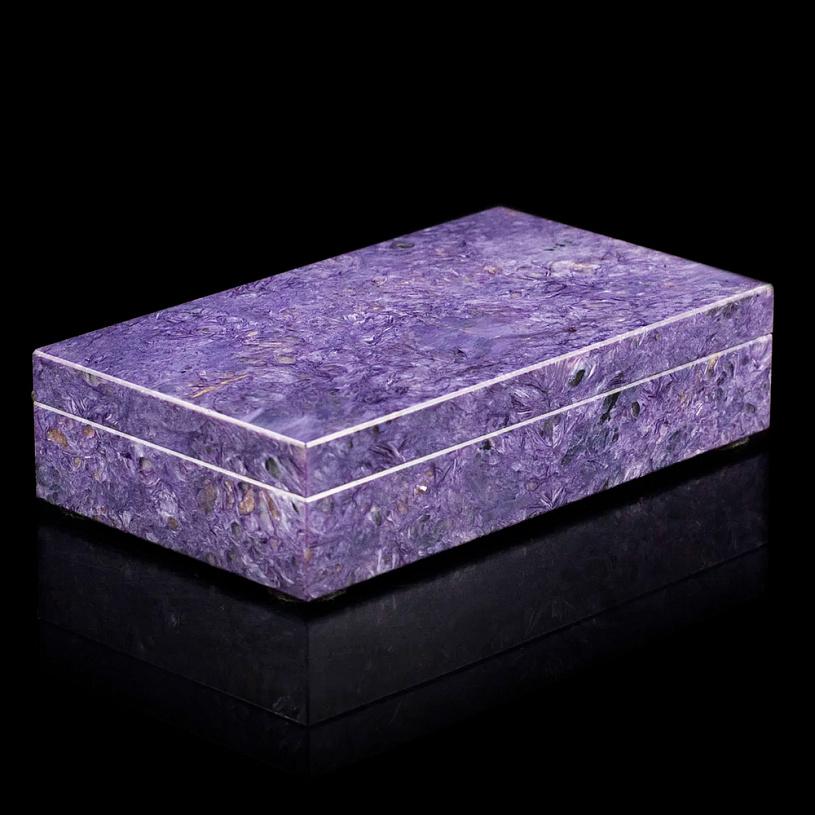 Благодаря бесшовной технике инкрустации пластин из чароита в шкатулке не видна базальтовая основа (в 99% шкатулок в мире видна основа).