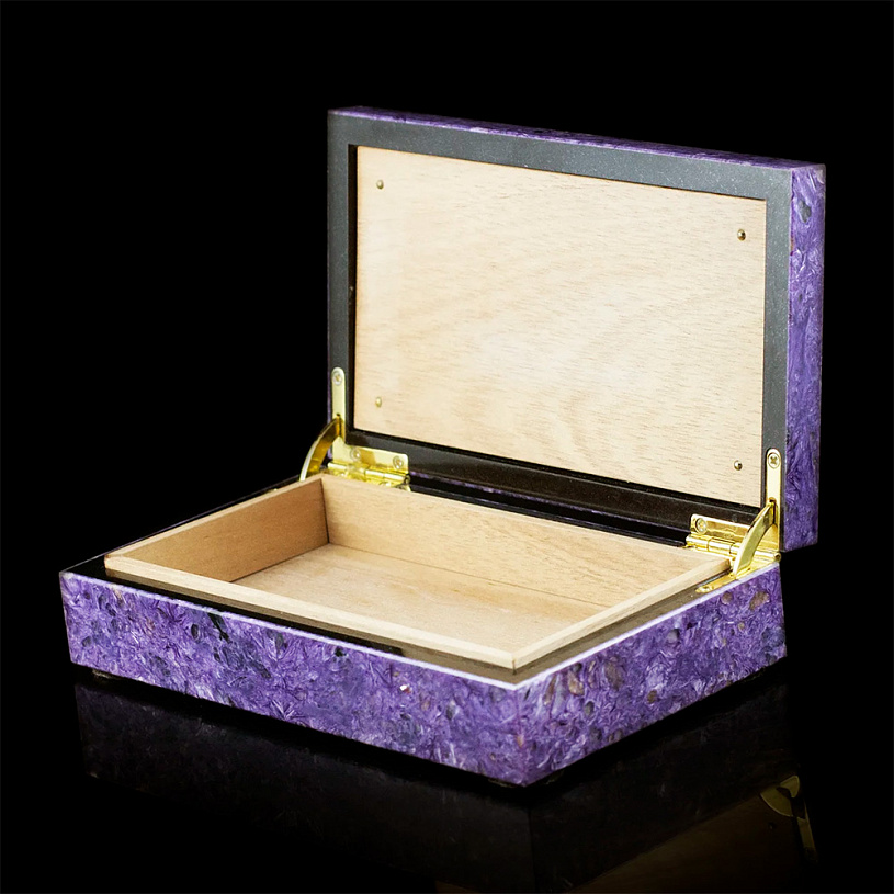 Уникальная каменная шкатулка для сигар 100% ручной работы из чароита, добытого на месторождении в Якутии. В шкатулке используется чароит экстра-класса ярко-сиреневого цвета. Из редкой породы выполнены верхняя и все боковые части шкатулки. Основа шкатулки — базальт черный.