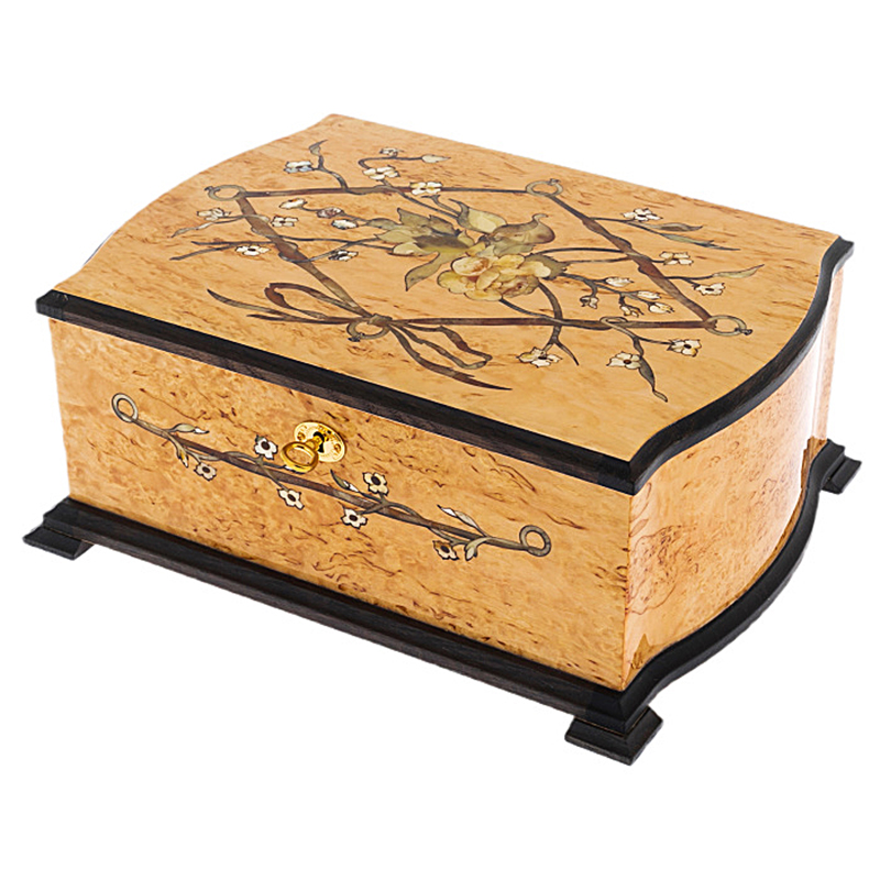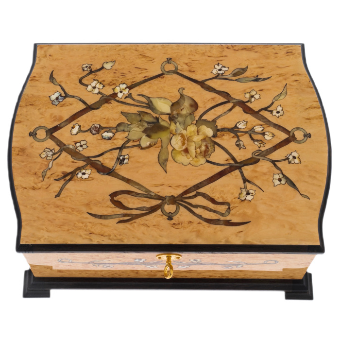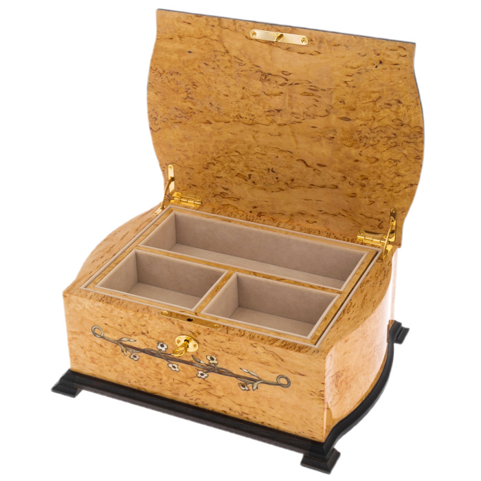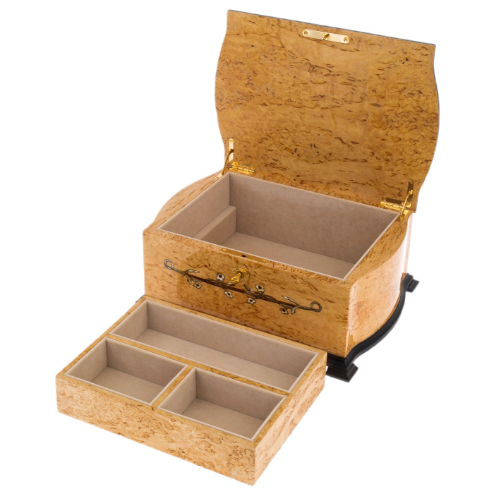 Шкатулка, выполненная из карельской березы и янтаря, является настоящим произведением искусства. Каждое изделие уникально, благодаря естественному узору, который проявляется на поверхности березы, а золотистые вкрапления янтаря добавляют элегантности и теплоты.