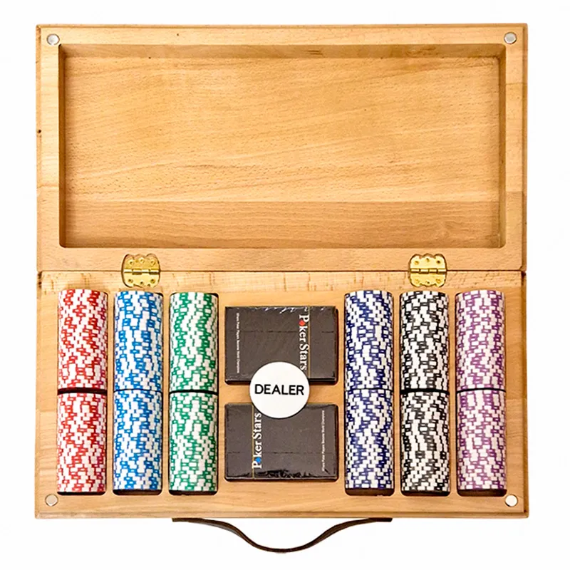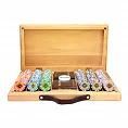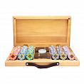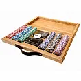 фишки: пластик с металлическим сердечником, кейс: дерево, карты: 100% пластик