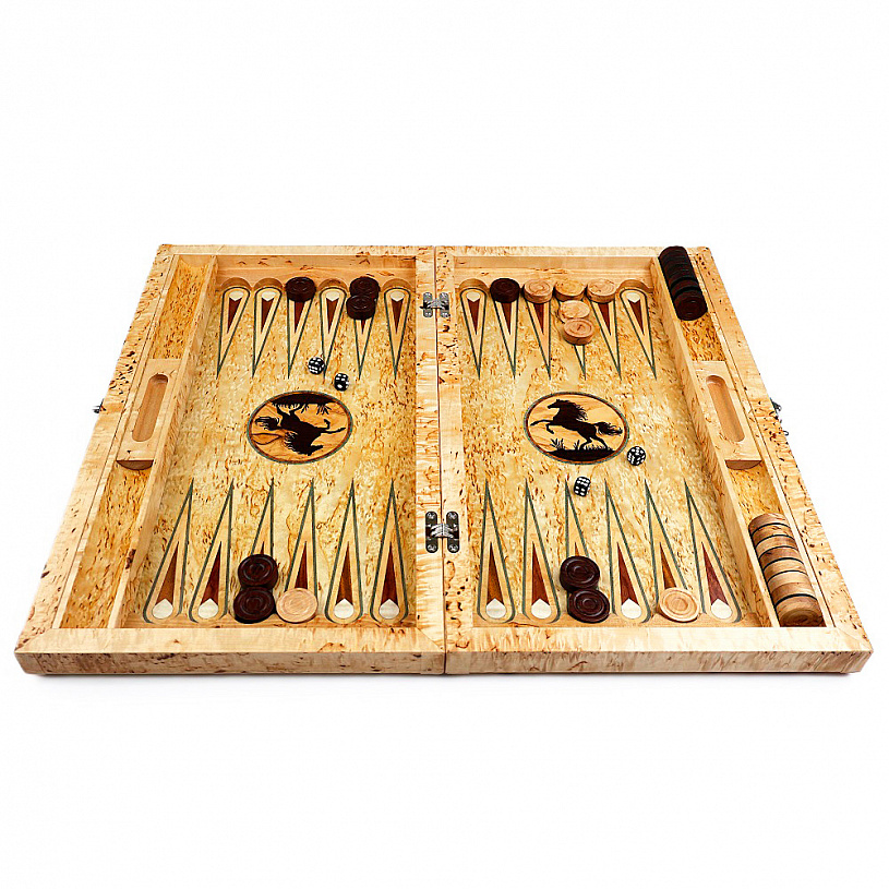 Игровые поля — карельская берёза , изображения-мозаика из ценных пород древесины. Фишки — латунь с деревянными вставками.