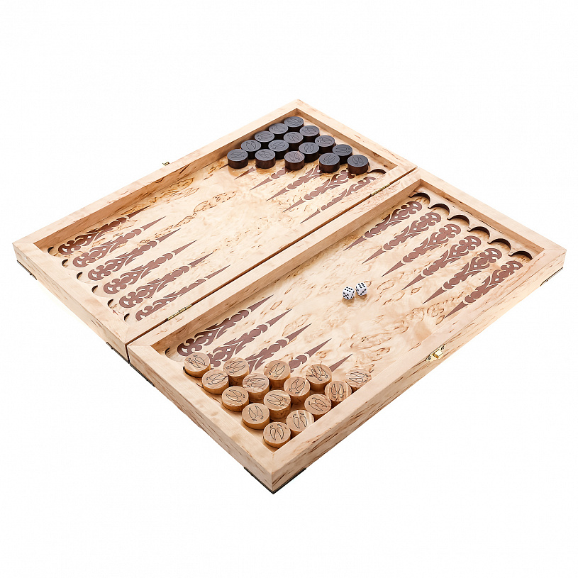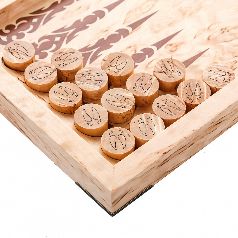 В набор входит: игровая доска с металлическим замочком, фишки диаметром 25 мм, токарные из массива, с нанесёнными на них следов кабана. Количество фишек 30 штук (15 штук темные и 15 штук светлые), кубики 4 штуки (пластиковые).