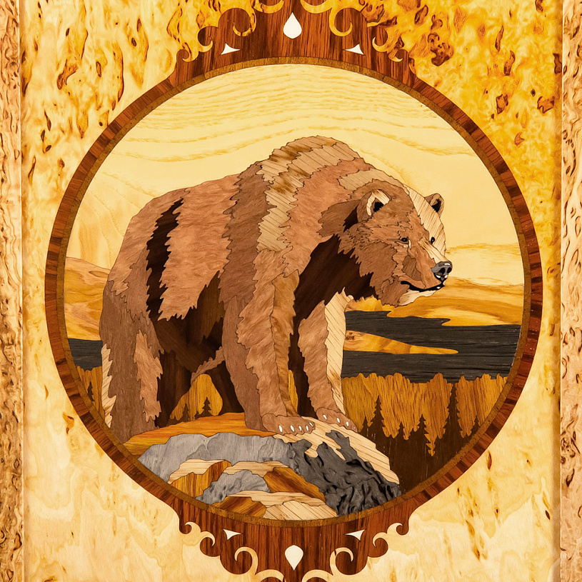 Изображение «Медведя» выполнено в технике «маркетри» (деревянная мозаика) из ценных пород древесины: клен сикаморе, ипе (бразильский орех), палисандр, ярра, оливковое дерево, тополь, мовингу.