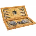 В набор входит: игровая доска с металлическим замочком, фишки диаметром 28 мм, в количестве 30 штук (15 штук темные и 15 штук светлые), два мешочка под фишки, кубики 4 штуки (пластиковые).