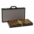 Этот игровой набор словно сошёл со страниц сказок Шахерезады. Доска из цельного массива мореного дуба инкрустирована кусочками солнечного янтаря, собранными в завораживающий восточный орнамент. Каждая ячейка поля переливается медовыми, карамельными и вишнёвыми оттенками, напоминая то узоры арабских ковров, то витражи дворцовых окон.