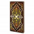 Этот игровой набор словно сошёл со страниц сказок Шахерезады. Доска из цельного массива мореного дуба инкрустирована кусочками солнечного янтаря, собранными в завораживающий восточный орнамент. Каждая ячейка поля переливается медовыми, карамельными и вишнёвыми оттенками, напоминая то узоры арабских ковров, то витражи дворцовых окон.