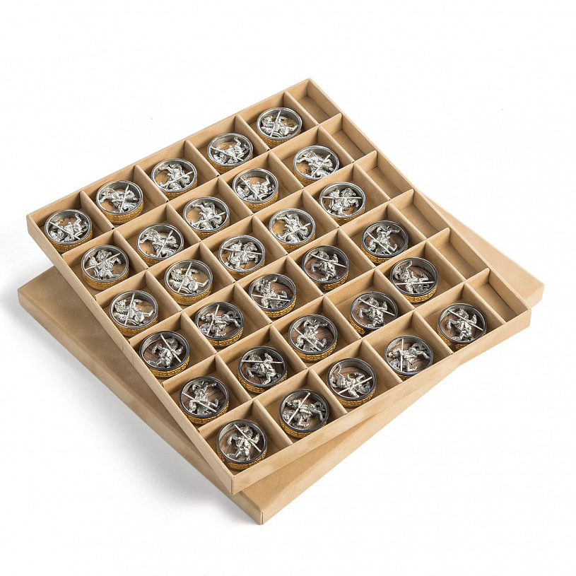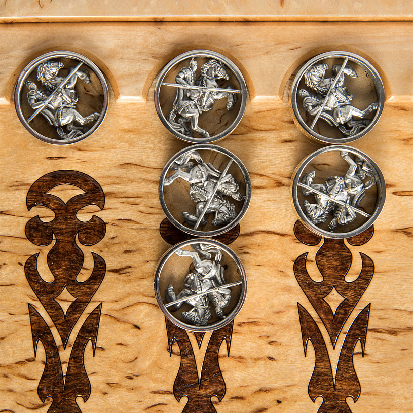 Светлые фишки (15 элементов) — Русское войско. На аверсе каждой фишки изображен конный воин Пересвет перед броском. Реверс покоится на деревянном основании, c наклееной алькантарой. Гурт украшен русским национальным орнаментом.