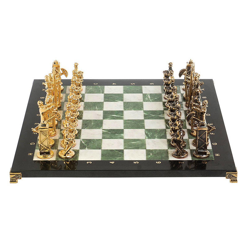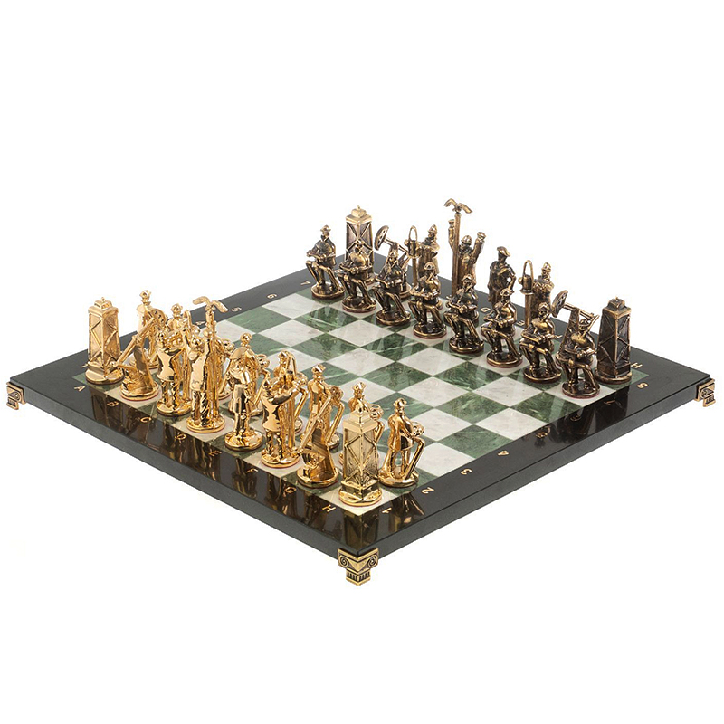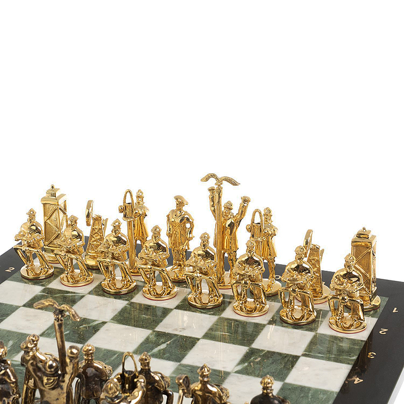 Доска изготовлена из натурального камня (змеевик, мрамор). Поверхность отполирована до зеркального блеска, а контраст клеток подчеркнут натуральными оттенками красного, черного и золотистого.