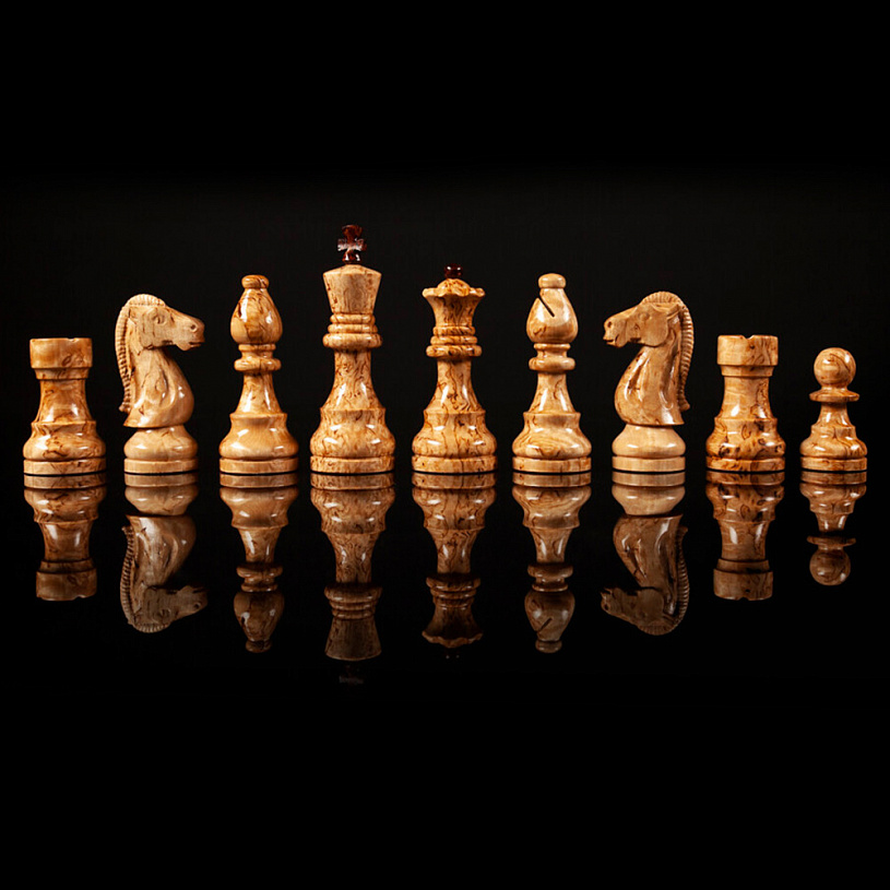 Фигуры изготовлены из массива карельской березы, утяжеленные, резные классические, эталонный стиль «Стаунтон», идеально сбалансированы, что позволяет легко маневрировать по доске.