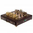 •Шахматный ларец изготовлен из дерева с элементами декора из бронзы и малахита. Ящики для фигур внутри обтянуты бархатом. Размер ларца 440*480*100мм.