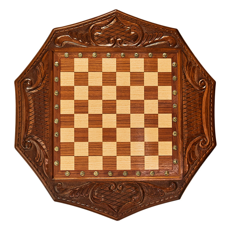 Стол шахматный "Сражение" выполнен с максимальной внимательностью к деталям. На самом поле буквы и цифры не просто нарисованы, а выполнены на отдельных металлических ставках. По бокам она украшена резкой, напоминающей изысканный венок.