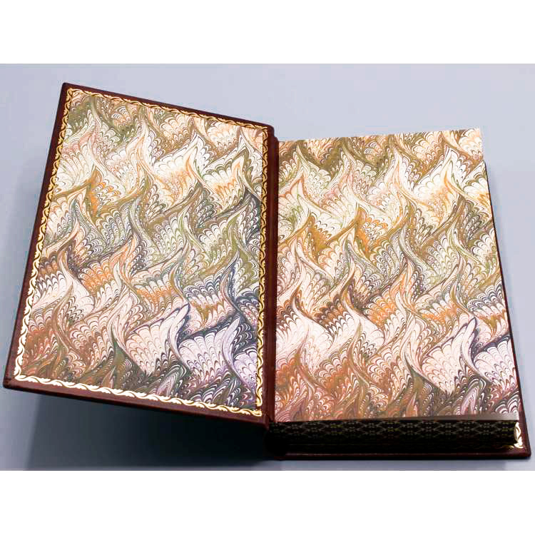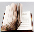 Книжный блок отпечатан на немецкой, дизайнерской бумаге высокого качества. Кожаный переплет ручной работы. Натуральная кожа. Цветное и блинтовое рельефное тиснение по коже. На корешке книги укреплены и украшены бинтами (гребешковые выступы). Ручная шлифовка и покраска обрезов книги с трех сторон. Дублюра откатана, так же мастером, вручную. Форзац - дизайнерская бумага.