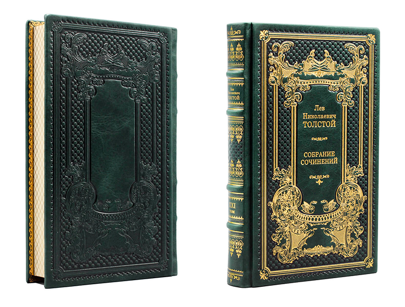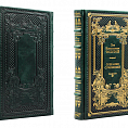 Кожаный переплет, исторический французский стиль, тиснение по коже золотом, конгревное и цветное тиснение. Книжный блок страниц отшлифован и тонирован с нанесением золотого орнамента.