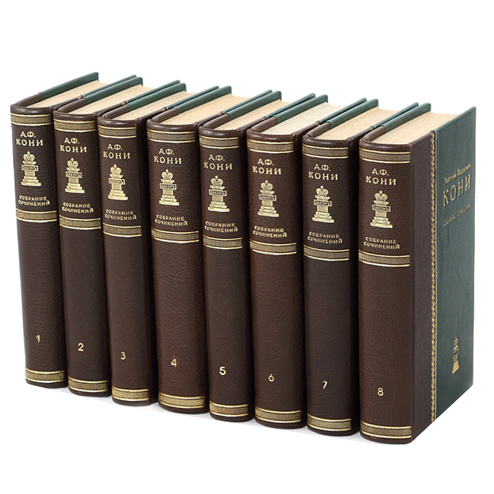 «Слово — одно из величайших орудий человека. Бессильное само по себе — оно становится могучим и неотразимым, сказанное умело, искренне и верно». Это убеждение стало неразлучным спутником жизни Анатолия Федоровича Кони. Выдающийся судебный деятель и ученый-юрист, он внес огромный вклад в становление русской юридической науки. Настоящее издание было выпущено в 1969 году издательством «Юридическая литература». В восьмитомное собрание сочинений вошли: статьи, публицистические выступления, воспоминания, обвинительные речи, описания наиболее примечательных дел и процессов из юридической практики писателя. Современный кожаный переплет ручной работы выполнен в переплетной мастерской издательства «Ламартис».