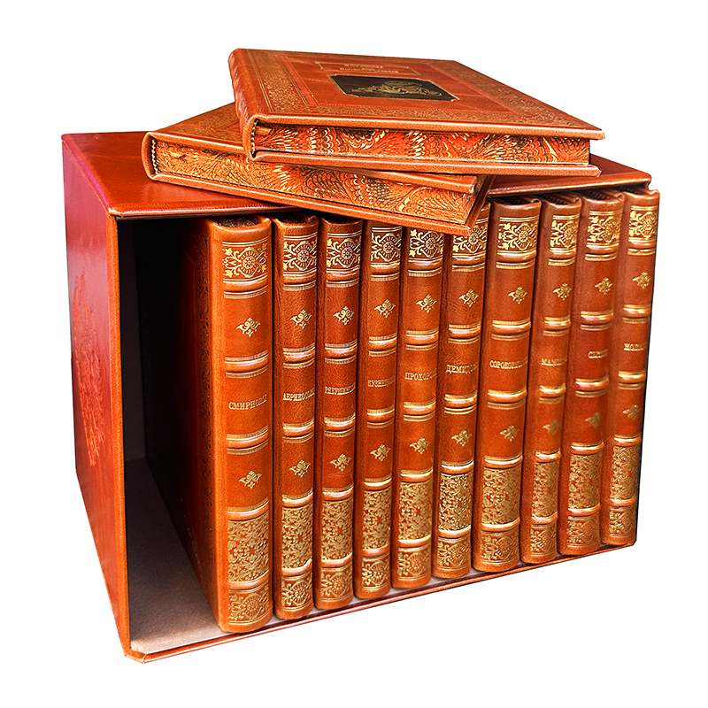 Богато оформленное собрание, представлено в подарочном издании. Цельнокожаный переплёт ручной работы, украшен золотым иблинтовым тиснением. Корешок декорирован бинтами. Текст книг напечатан на офсетной бумаге. Обрез оформлен художественным изображением. Ляссе из шёлковой ленты. Форзац цельный из дизайнерской бумаги. Дублюра окатана золотом.