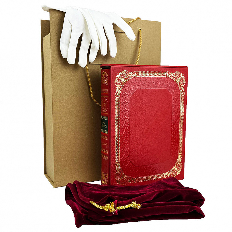 Богато оформленное издание, представлено в подарочном футляре из натуральной кожи.. Цельнокожаный переплёт из натуральной кожи шагрени, ручной работы, украшен цветной кожаной вставкой, а также блинтовым и золотым тиснением. Корешок декорирован бинтами. Текст книги напечатан на мелованной бумаге. Обрез оформлен художественным изображением. Ляссе из шёлковой ленты. Форзац из дизайнерской бумаги. Дублюра окатана золотом.
