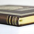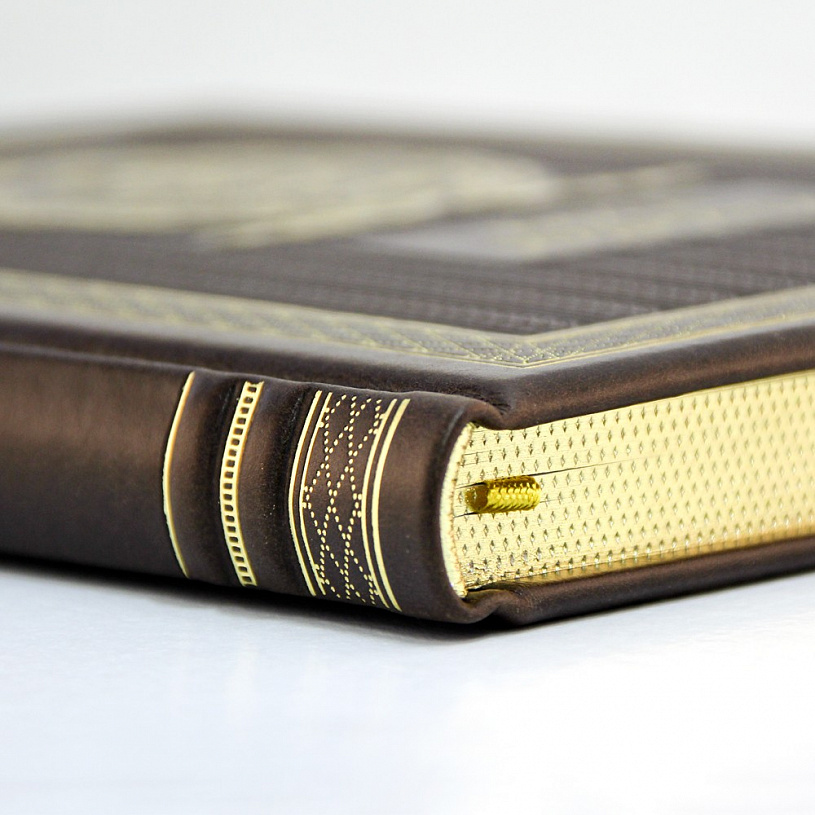 Переплёт ручной работы из натуральной кожи. Форзац из дизайнерской бумаги. 4 бинта на корешке, ручной обработки. Каптал золотой из натуральной кожи. Обрез блока торшонированный золотой. Тиснение блинтовое и золотой фольгой. Ляссе.
