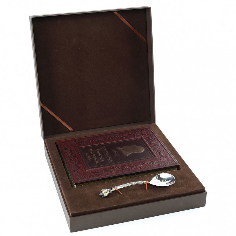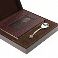 Большая серебряная столовая ложка ручной работы идет в комплекте с коллекционным изданием книги в футляре.